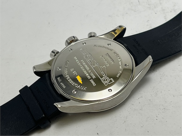 錶背刻印 Ferrari F1 世界冠軍文字與年份,如果這枚錶沒有鐫刻特定 2002 年的話那錶主恐怕可以當作好多年的紀念版本,畢竟法拉利及舒馬克可是整整從 2000 年一路五連冠到了 04 年,非常帶勁。