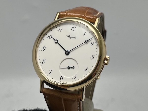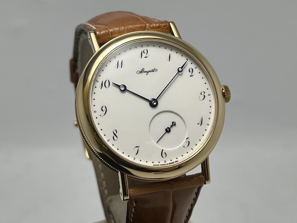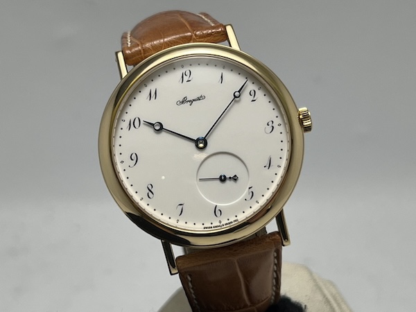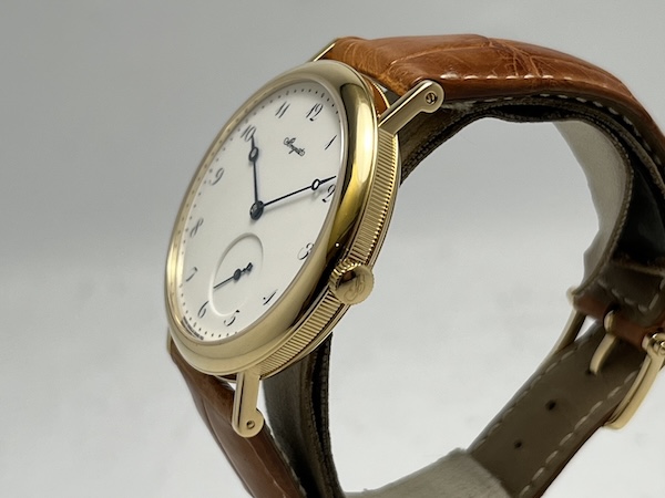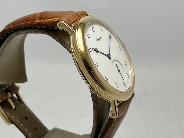 Unisex. Cal.502.3SD 自動上鏈,時分秒針顯示。大明火琺瑯面盤,寶璣式阿拉伯數字時標與針組。隱藏防偽 Logo。