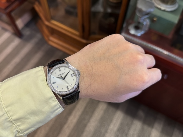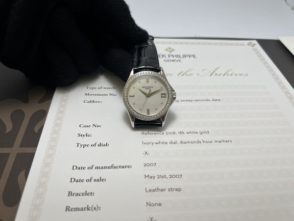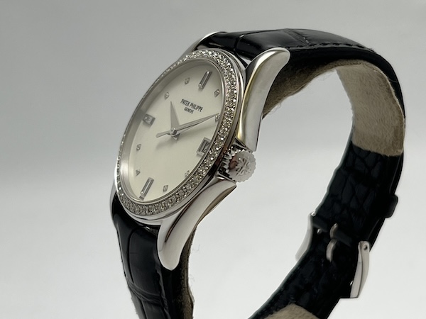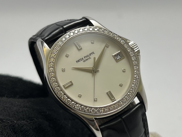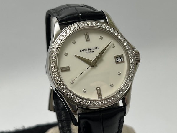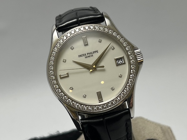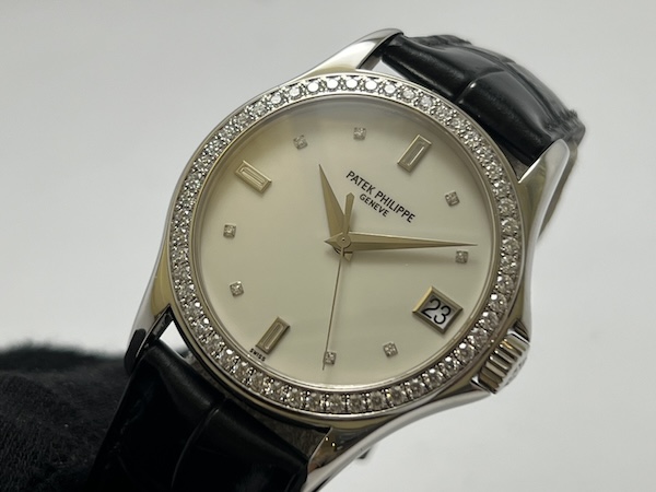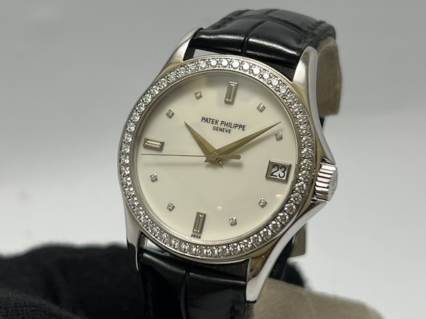 18K White Gold. Calatrava 5108G Ivory Porcelain 象牙白瓷面 原鑲鑽石錶圈、圓形&長方形鑽石時標 37mm.