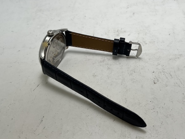 腕錶配有潔白錶盤、加大黑色阿拉伯數字時標、小秒盤、手動上鍊機芯,並搭配原裝鱷魚皮錶帶。