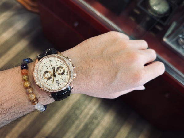 獨特的橢圓形設計優雅,市場上我們也很難看到圓形及方形以外的造型;原廠鑲嵌著 128 顆圓形天然鑽石(約 1.4 克拉)的閃耀錶圈,更進一步提升了整只腕錶的華貴氣息。