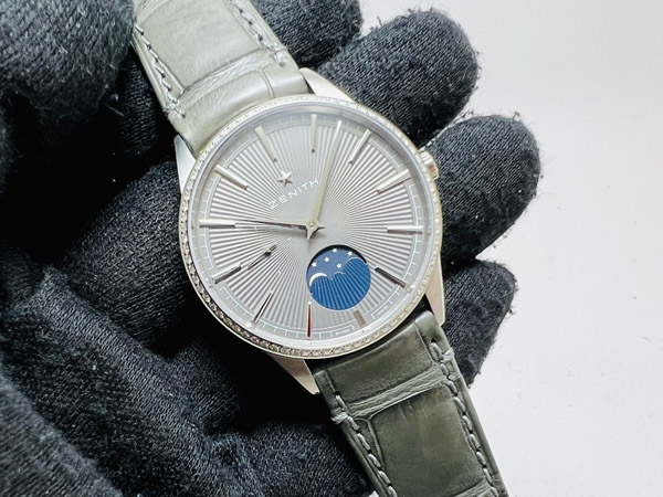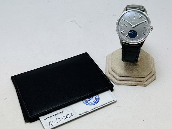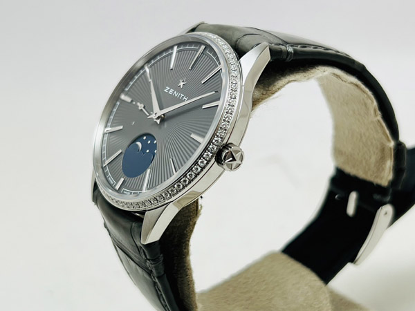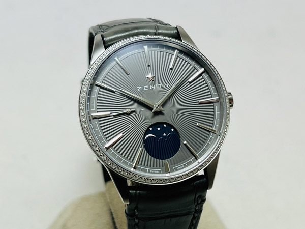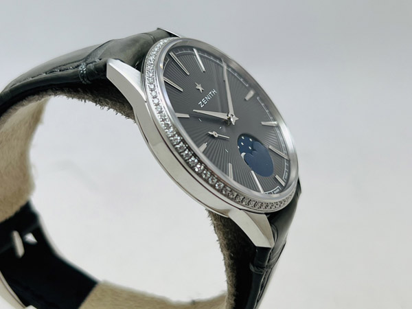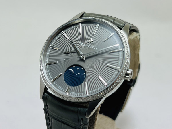 男錶,Cal.Elite 692 自動機芯,時分秒針、月相指示;原鑲鑽石錶框,共重 0.615 CTS. 50 小時動力儲存;防水 50 M。