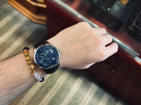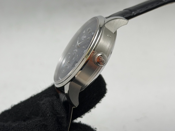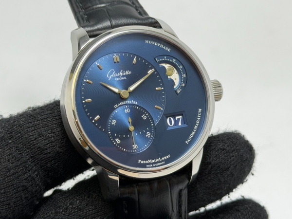 值得一提的是,這款偏心月相腕錶上完美的藍色調,由 Glashutte Original 位於德國普福爾茲海姆 (Pforzheim) 的自有錶盤廠經驗豐富的團隊精心打造。這藍色是來自對電鍍過程的嚴謹監控、加上 40 個生產步驟的精準規劃才換來最完美的藍色調。此外這些普福爾茲海姆專家們最讓人欽佩之處,還有他們替位於 2 點鐘位置的月相顯示所特別打造的優雅造型 — 銀色夜空襯托著銀色月亮和繁星。