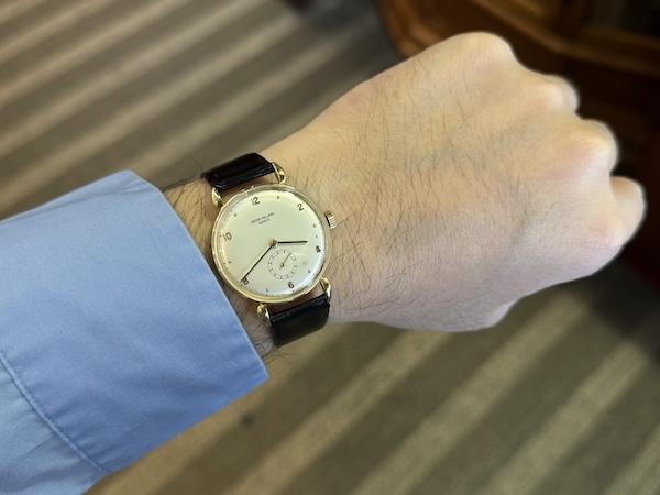 這只 Vintage PP 的爪形錶耳 aka 淚滴耳(Tear Drop Lugs)可以說有如 MJ 的後仰跳投,李尋歡的小李飛刀,都是個別對象的 signature。原始未經修飾的銀色錶盤非常漂亮,錶盤上的偶數位置採用金色阿拉伯數字做為根基,奇數位置則以圓珠點裝飾。小秒針環上的簡單分隔刻度不搶調也很貼旋律。